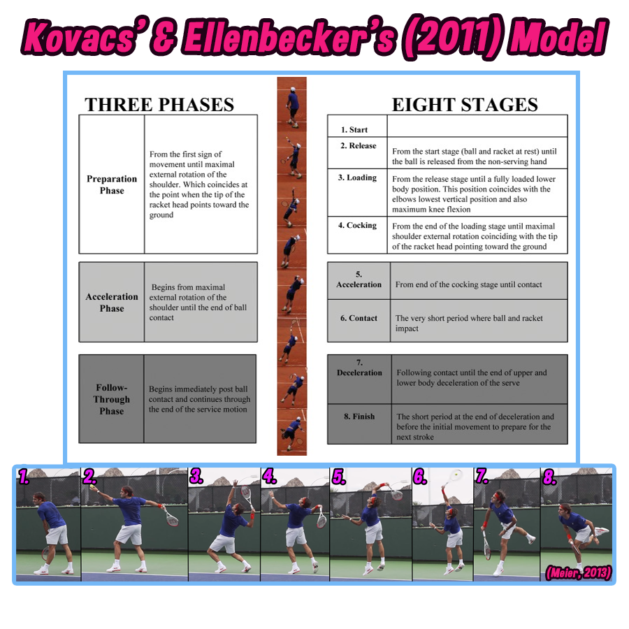 Whilst individual serving styles are unique, Abrams, Harris, Andriacchi, & Safran (2014) highlighted three distinct serves: flat, kick and slice. The flat serve, characterised by reduced topspin, produces the greatest horizontal velocity following contact, and will be the focus of this blog (Sakurai, Reid, & Elliott, 2012). Furthermore, the serve can be disassembled into three movement phases: preparation, acceleration and follow-through, and further into eight unique stages as evident below (Kovacs & Ellenbecker, 2011).