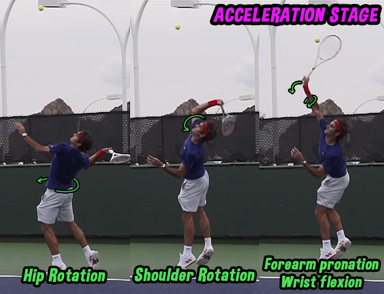 Vigorous acceleration of the contact arm defines the acceleration stage, as PE stored during preparation is translated to a fast serve (Kovacs & Ellenbecker, 2011). The body undergoes a corkscrew motion as the angular velocity of successive limb segments sequentially increases until contact (Kovacs & Ellenbecker, 2011). As displayed in Figure 5, the hip internally rotates, followed by trunk and shoulder internal rotation, forearm pronation and wrist flexion (Elliott, 1988).