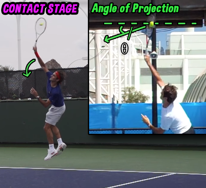 The contact stage commences and ceases upon contact with the ball (Kovacs & Ellenbecker, 2011). During this stage an unequal force imparted by the racquet acts on the ball, redirecting it under Newton’s First Law (Blazevich, 2017). Contact occurs at an angle of projection on or below the horizontal, aided by aptly displayed shoulder, elbow and wrist flexion, per Figure 9 (Fleisig, et al., 2003). Likewise, Whiteside, Elliott, Lay, & Reid (2013) found adult female professional players exhibited a mean projection angle of -6.8°, contrasting an angle of -5.4° amongst a cohort of 5 ranked, teenage players. This negative projection angle is a result of ball contact occurring at a positive relative height, with the tennis court lower than the contact point (Blazevich, 2017). Ultimately, the lower the projection angle the greater the horizontal velocity the tennis ball can exhibit, decreasing time of curvilinear flight, and resultant ball range (Blazevich, 2017). This was supported by Whiteside, et al. (2013), documenting female professional players exhibited an average horizontal ball velocity of 43.9 m.s-1, over 33.0 m.s-1 amongst the comparative. Nevertheless, optimal technique is largely reliant on intrinsic characteristics, such as height; however, if the ball is to exhibit a high horizontal velocity the angle of projection must be regulated, imparting force above the horizontal, relative to the height of contact.