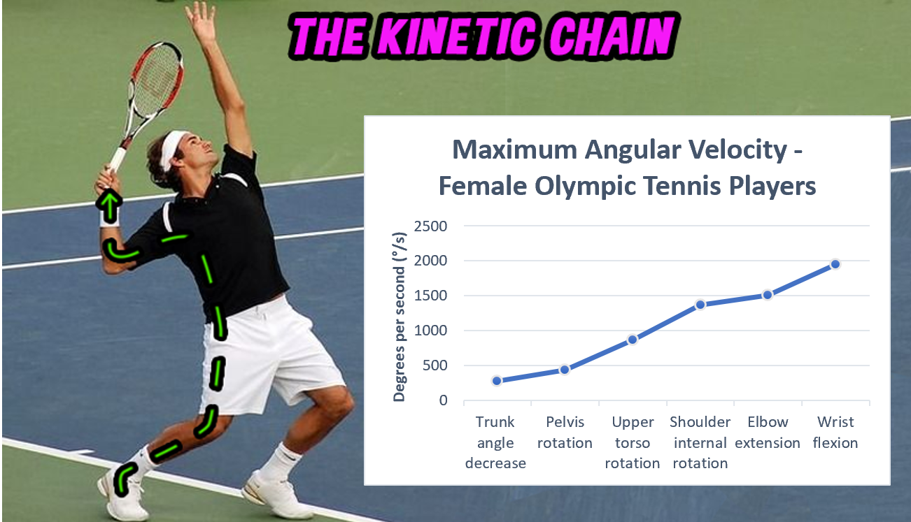Momentum is conserved throughout the entire kinetic chain: defined as the successive sequence of moving parts or levers contributing to the serve (Elliott, 2006). This sequential movement is an example of a throw-like movement, as the momentum generated through acceleration of proximal segments is transferred distally (Blazevich, 2017). Resultantly, angular velocity increases sequentially before contact per Figure 7, with the wrist reaching speeds of 1950 ± 510 deg.s-1 (Fleisig, et al., 2003). Angular momentum (H) is a product of MOI and angular velocity; therefore, as momentum is conserved, successive limb segments periodically decrease in MOI due to decreasing weight and radius of gyration, exhibiting increased angular velocity (Blazevich, 2017). Roberts & Azizi (2011) highlighted this throw-like movement also promotes the greatest use of elastic PE stored within tendons during the preparation phase. As the proximal limbs begin to move, the tendons of distal segments stretch as they lag behind, then recoil at significant speed because of their relatively low mass (Blazevich, 2017). Nonetheless, a throw-like pattern does not favour accuracy; therefore, beginners commonly rely on a cohesive push-like movement, counter-productive to power (Blazevich, 2017). Rather, to ensure optimal force production, as the player advances a throw-like pattern must be promoted.